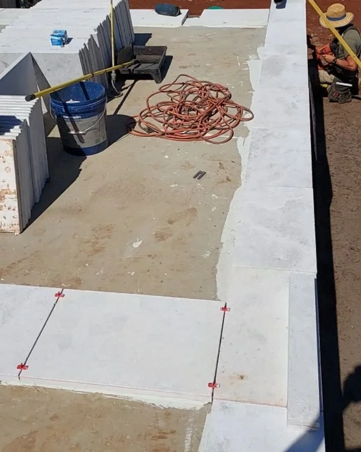Depending on the area and density of subsoil we may need to pave on a ruff screed concrete base. For example, around pools we will pave on a reinforced concrete pre-lay slab that is tied into the bond beam of your pool. When paving with mortar, we will also paint all surface areas with a bonding agent to maximise adhesion. With a pool being a wet area, we will make sure all water runs to drainage points or storm water.